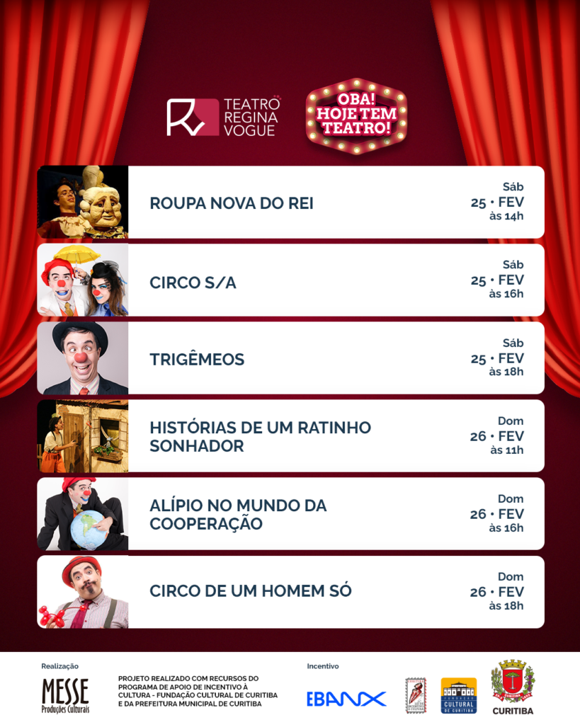 Neste fim de semana, dias 25 e 26 de fevereiro, o Teatro Regina Vogue recebe seis espetáculos no projeto “Oba, hoje tem teatro”. Na agenda do sábado (25/02), às 14h tem “A roupa nova do rei”; às 16h, se apresenta o Circo S/A; e às 18h, “Trigêmios". No domingo (26/02), tem “Histórias de um ratinho sonhador”, às 11h; seguido por “Alípio no mundo da cooperação”, às 16h; e para finalizar, o espetáculo “Circo de um homem só”, às 18h. Não tem desculpa para não sair de casa e se divertir, as apresentações possuem o Ingresso Consciente, ou seja, o público, consciente do trabalho envolvido para realização do evento e do valor que ele dá para vivenciar esta experiência, escolhe se quer ou quanto acha adequado pagar pelo seu ingresso, de acordo com a sua condição financeira. O dinheiro das entradas vai para o pagamento dos custos da apresentação como, equipe técnica, alimentação, divulgação, e o restante é dividido entre os grupos participantes. O teatro está localizado dentro do Shopping Estação, no piso L2. Os ingressos estão à venda no site https://www.diskingressos.com.br. Serviço 6 espetáculos de teatro com ingresso consciente Ingressos: https://www.diskingressos.com.br Onde: Teatro Regina Vogue Av. Sete de Setembro, 2.775, Rebouças Curitiba (PR) (41) 3094-5300 https://www.instagram.com/shopping_estacao/www.shoppingestacao.com.brSobre o Shopping Estação O Shopping Estação é ponto de encontro e referência em entretenimento e gastronomia na cidade, com um mix de lojas e serviços completo, além de reunir parte da história de Curitiba no Museu Ferroviário, único museu dentro de um shopping no Brasil. Inaugurado em 14 de novembro de 1997, há 25 anos o Shopping Estação tem participação ativa na vida dos curitibanos e de milhares de turistas que passam pela capital paranaense.