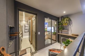 A textura e a cor dos suportes são outros fatores importantes para evitar a propagação do calor no espaço. “O ideal é que as estantes e bancadas sejam de cores claras, que não absorvam tanto os raios solares. A textura amadeirada contribui para a construção do ambiente natural, além de ser uma estampa coringa em todas as estações do ano.” Uma ideia é a criação de uma bancada em madeira clara acima da caixa de ar-condicionado, também sugerida no decorado do empreendimento Vibe. Além de proporcionar mais um espaço para ser utilizado, a bancada traz um tom contemporâneo e sutil ao ambiente.