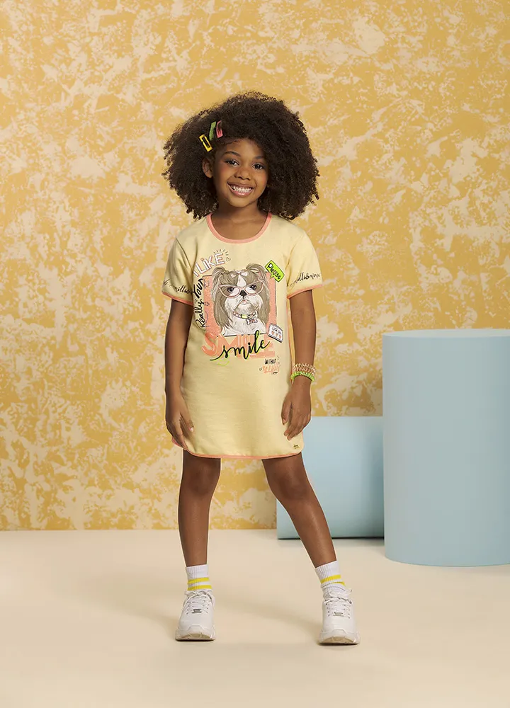 Legenda: O vestido “Smile” da marca Milli&Nina é feito em malha leve, com cores vibrantes e com a cara do verão. A peça possui uma estampa de cachorrinho e bordado de lantejoula com proteção que não machuca a criança. O preço é a partir de R$47,45.