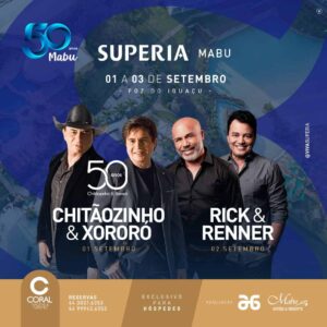 Além disso, como parte da celebração dos 50 anos o Grupo Mabu promoverá um evento especial entre os dias 01 a 03 de setembro, com dois shows comemorativo com a dupla Chitãozinho e Xororó, que também comemoram 50 anos de carreira nesse ano, e com a apresentação da dupla Rick e Renner. O final de semana promete ser memorável, com uma experiência única aos hóspedes. As reservas para participar desse final de semana de comemorações já estão abertas e podem ser efetuadas pelo site: https://eventos.a6producoes.com.br/superia-mabu-chx-rr .