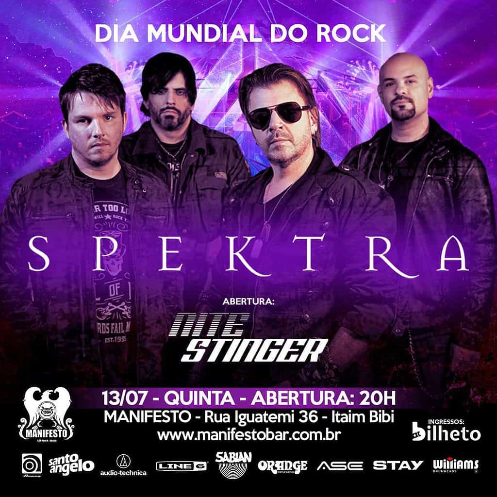 Serviço Dia Mundial do Rock – Manifesto Bar Bandas: Spektra e Nite Stinger Data: 13 de julho de 2023 (quinta-feira) Local: Manifesto Bar Endereço: R. Iguatemi, 36 - Itaim Bibi (São Paulo/SP) Horários: 20h (portões), 21h (evento) Ingressos: a partir de R$ 50 Venda online: https://bilheto.com.br/evento/1530/Dia_Mundial_do_Rock_-Bandas_Spektra_e_Nite_Stinger Mais infos: @manifestobar Foto: Thiago Kiss