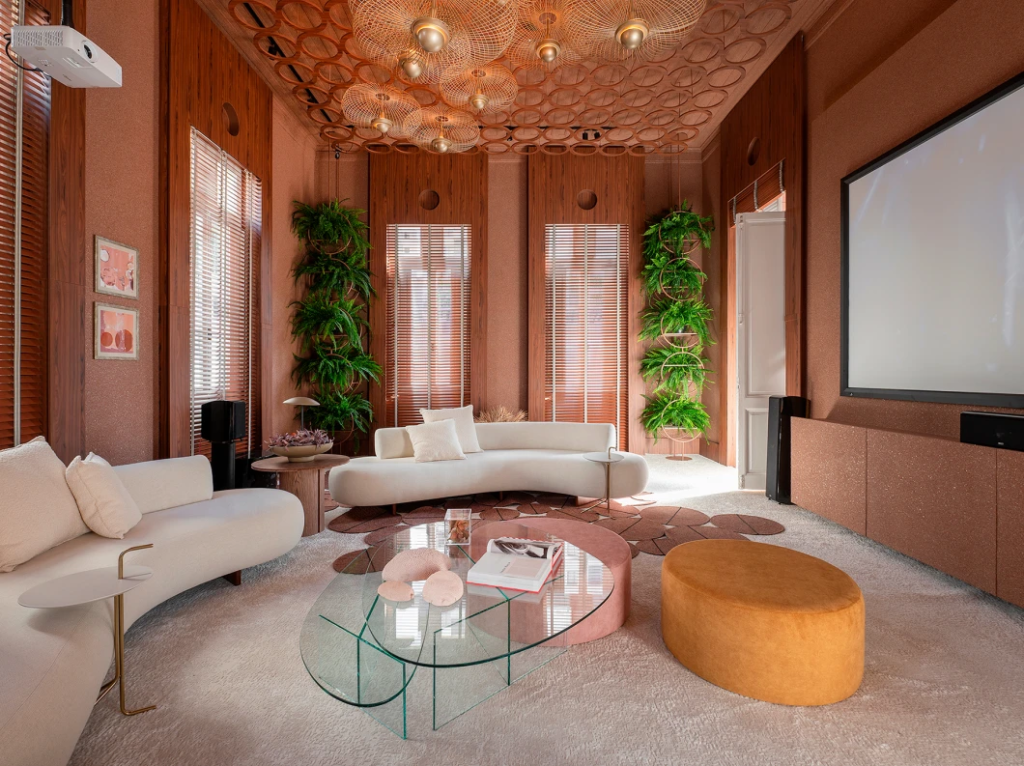 Para quem quiser ousar e dar um upgrade na decoração, o uso de cores alegres e vibrantes pode transformar qualquer ambiente. Os tons mais rosados foram a escolha da arquiteta Anna Maya para esse projeto de 60m². Para complementar e deixar o décor mais fluído e elegante, a profissional apostou no uso de formas circulares em diferentes soluções. Além disso, os painéis com o padrão Pau-Ferro, da Sudati, trazem toda a força e a beleza dos elementos naturais para o projeto.