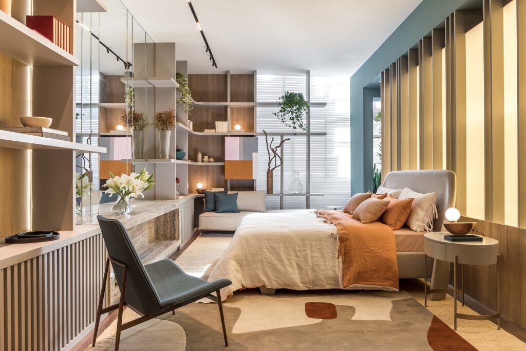 Já quem deseja trazer as tonalidades mais quentes aos poucos, a dica é apostar em pontos de cor! Nesse apê, a arquiteta Mariana Marchioro trouxe a poltrona Duda, da Estofados Jardim, para dar um toque de cor na paleta cromática mais neutra. Além disso, os painéis ripados também auxiliam nessa missão.