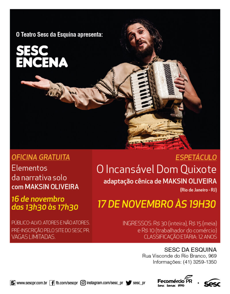 Baseado em um dos mais importantes livros da literatura espanhola, o ator Maksin Oliveira traz ao palco do Teatro do Sesc da Esquina, na quinta-feira (17), o espetáculo . Trata-se de uma peça repleta de histórias fantástica do famoso cavaleiro Dom Quixote, que sai de casa com o desejo de transformar o mundo em um lugar melhor, acompanhado por seu fiel escudeiro, Sancho Pança. , em circulação desde 2013, é um solo narrativo com inúmeras premiações e participações em festivais de todo o mundo. Conquistou o prêmio de Melhor Ator em todos os festivais competitivos que participou, além de prêmios de Melhor Direção, Espetáculo, Iluminação e indicação para Melhor Figurino e Texto. Além do espetáculo, Maksin será o ministrante da oficina que ocorrerá no dia 16 de novembro, também no Sesc da Esquina. A oficina é gratuita, destinada a atores e não atores, e abordará sobre a construção de narrativa individual a partir de elementos textuais, ficcionais, autobiográficos, sonoros, imagéticos e corporais. Ingressos estão disponíveis para venda no SAC da unidade. A pré-inscrição para a oficina é gratuita e devem ser feita pelo site do Sesc PR.