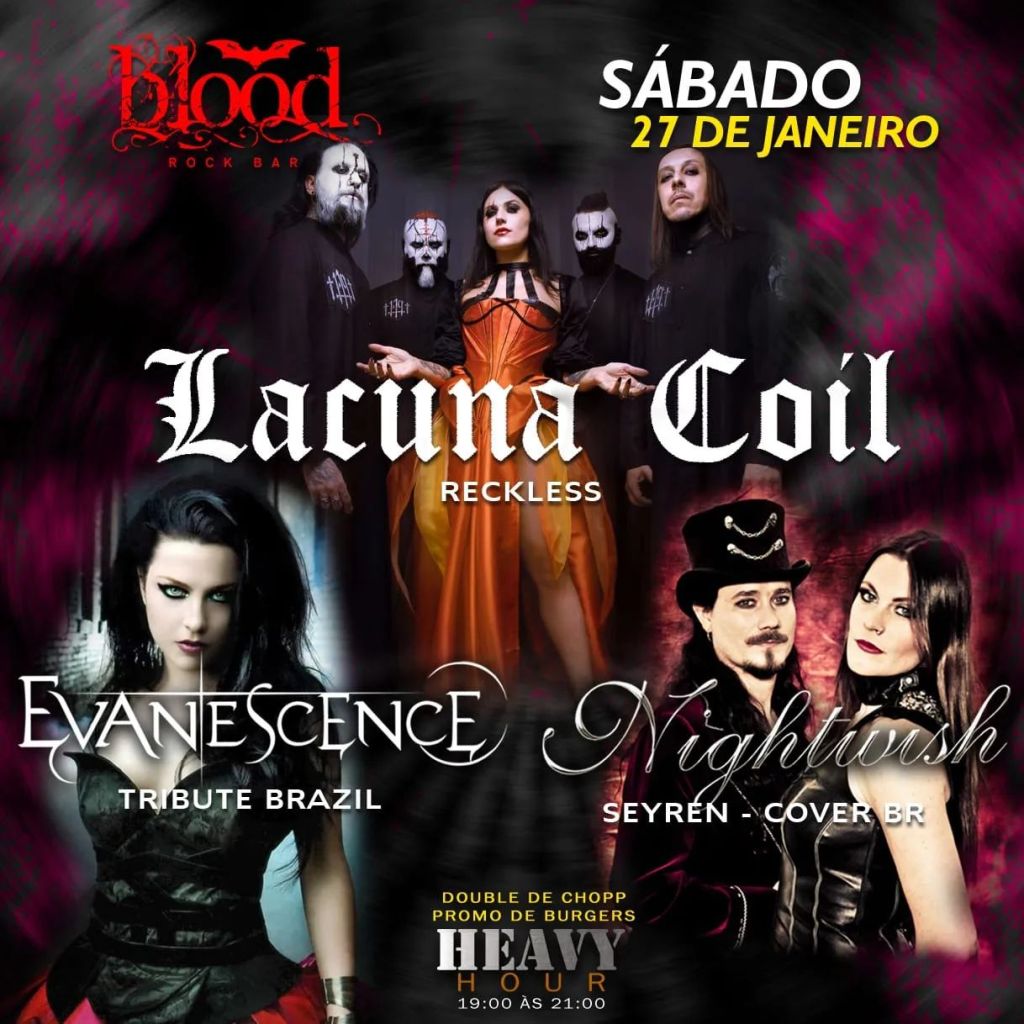 Seyren (Nightwish), Evanescence Tribute Brazil e Reckless (Lacuna Coil) Data: 27 de janeiro de 2024 (sábado) Local: Blood Rock Bar Endereço: Rua Carlos Cavalcanti, 1212 – São Francisco Horário: 19h (abertura da casa), 22h (shows) Entrada: R$ 10 (até 21h), depois, R$ 15 Ingressos no local